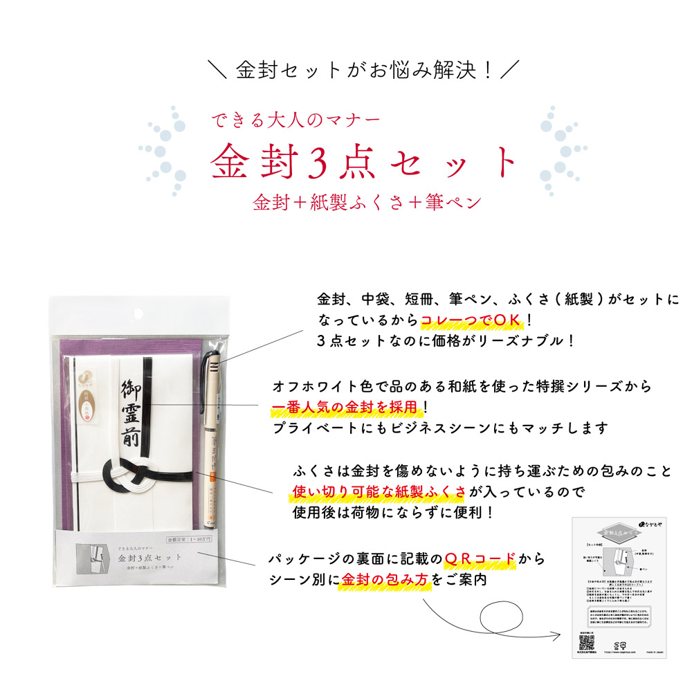 ☆特撰小間紙シリーズ売れ筋金封、紙製オリジナルふくさ、書きやすい細字筆ペンの、必要十分な3点セットです。