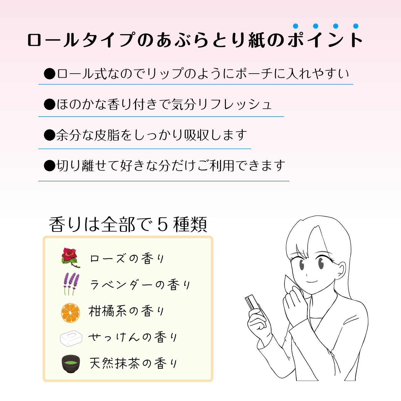 ほのかに柑橘系が香りがするあぶらとり紙です。